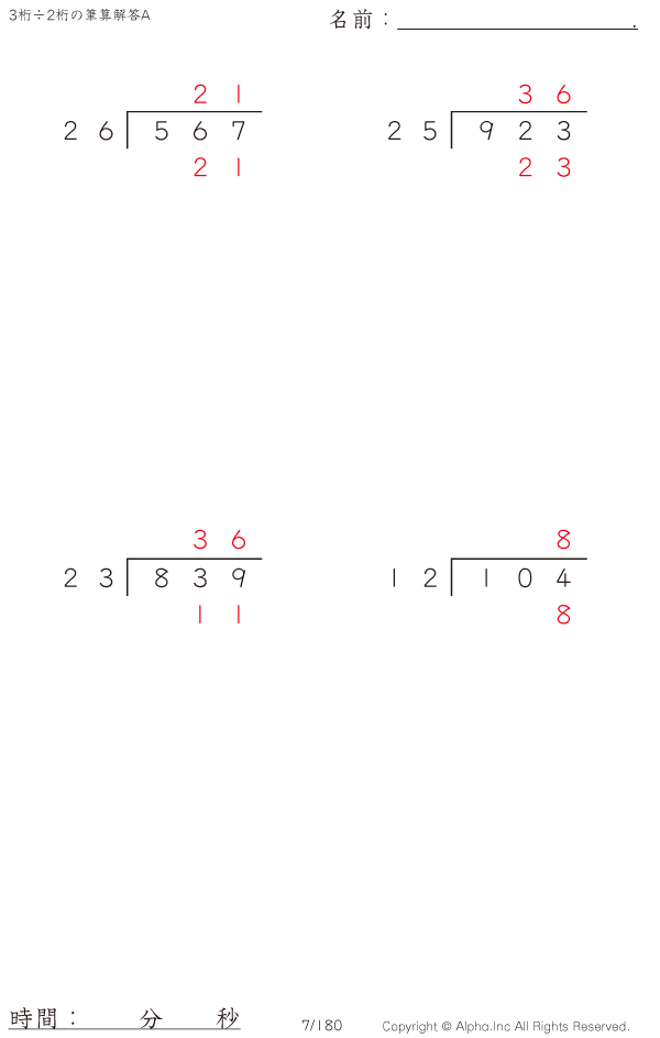 3桁÷2桁の筆算A(30までの数値で割る) [解答]007/180