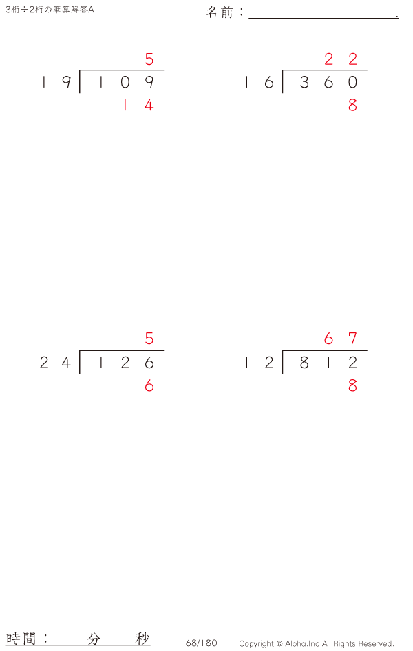 3桁÷2桁の筆算A(30までの数値で割る) [解答]068/180