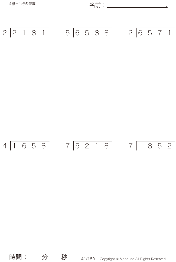 上記のボタンから「4桁÷1桁の筆算」の算数数学ドリル・計算ドリル(PDFプリント)がダウンロードできます。個人利用は無料です(家庭以外での配布は有料です)。