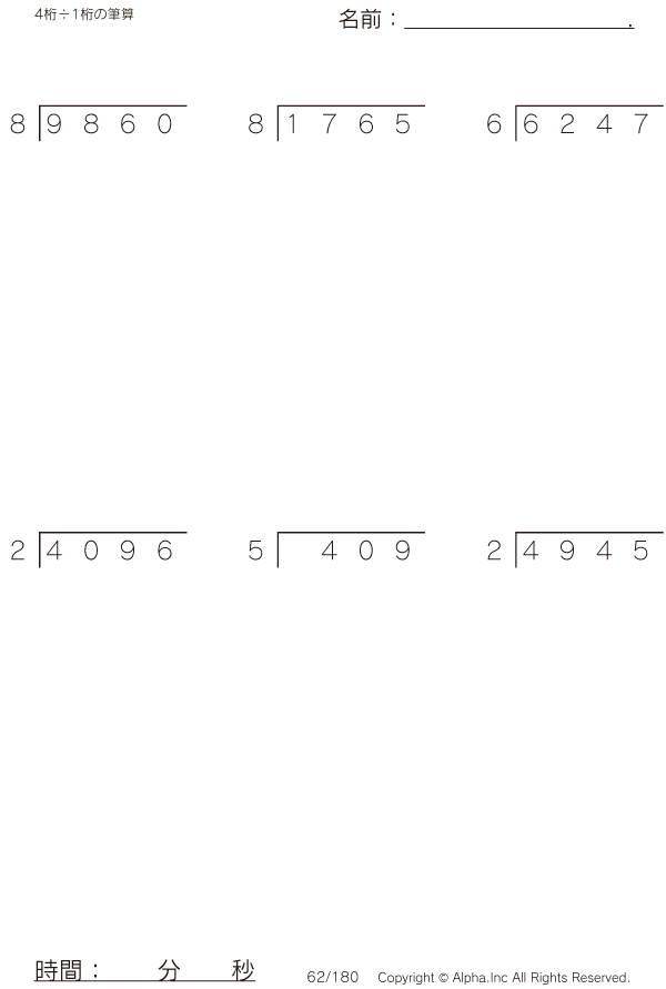 上記のボタンから「4桁÷1桁の筆算」の算数数学ドリル・計算ドリル(PDFプリント)がダウンロードできます。個人利用は無料です(家庭以外での配布は有料です)。