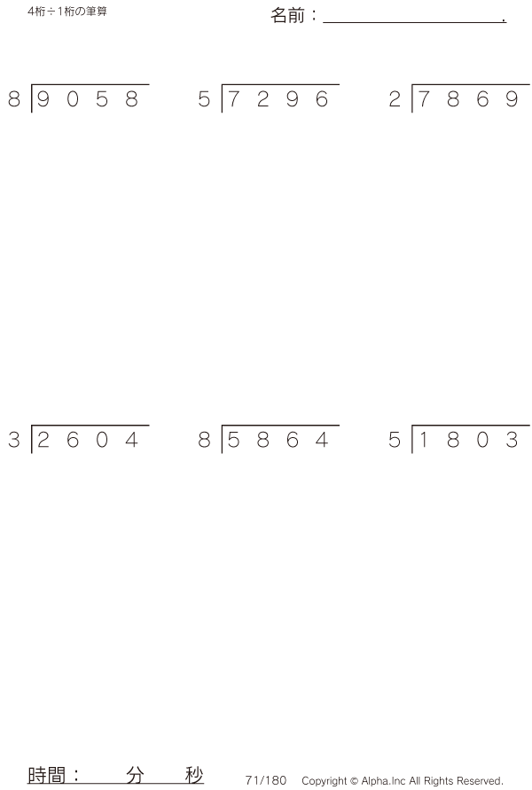 上記のボタンから「4桁÷1桁の筆算」の算数数学ドリル・計算ドリル(PDFプリント)がダウンロードできます。個人利用は無料です(家庭以外での配布は有料です)。