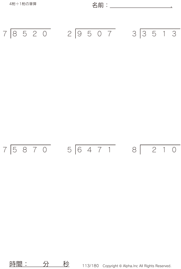 上記のボタンから「4桁÷1桁の筆算」の算数数学ドリル・計算ドリル(PDFプリント)がダウンロードできます。個人利用は無料です(家庭以外での配布は有料です)。