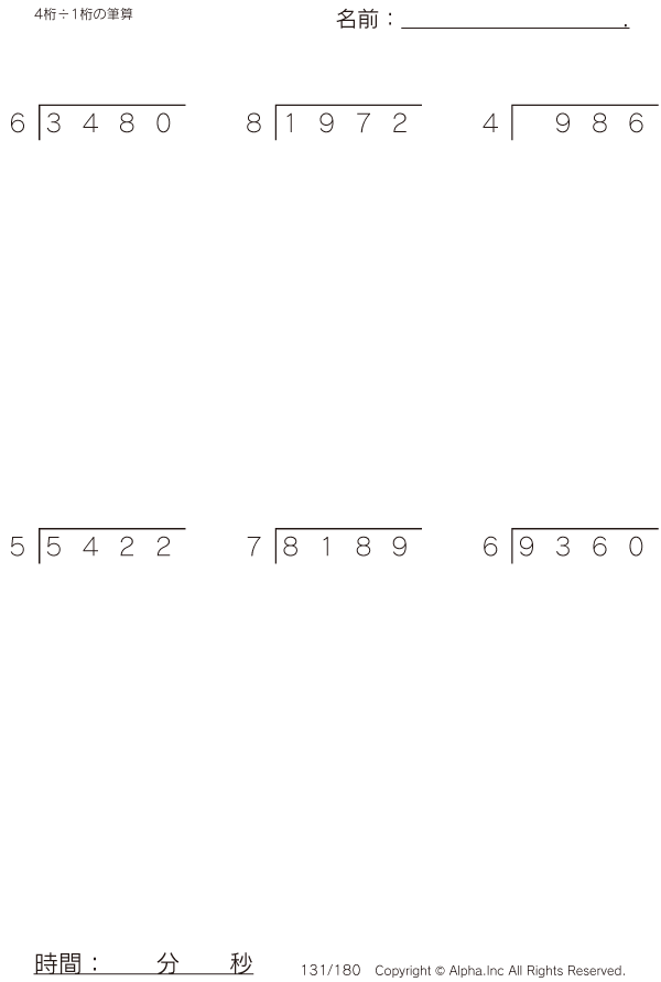上記のボタンから「4桁÷1桁の筆算」の算数数学ドリル・計算ドリル(PDFプリント)がダウンロードできます。個人利用は無料です(家庭以外での配布は有料です)。