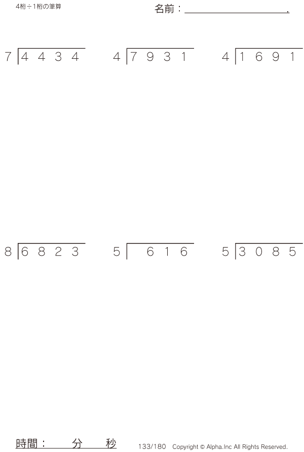 上記のボタンから「4桁÷1桁の筆算」の算数数学ドリル・計算ドリル(PDFプリント)がダウンロードできます。個人利用は無料です(家庭以外での配布は有料です)。
