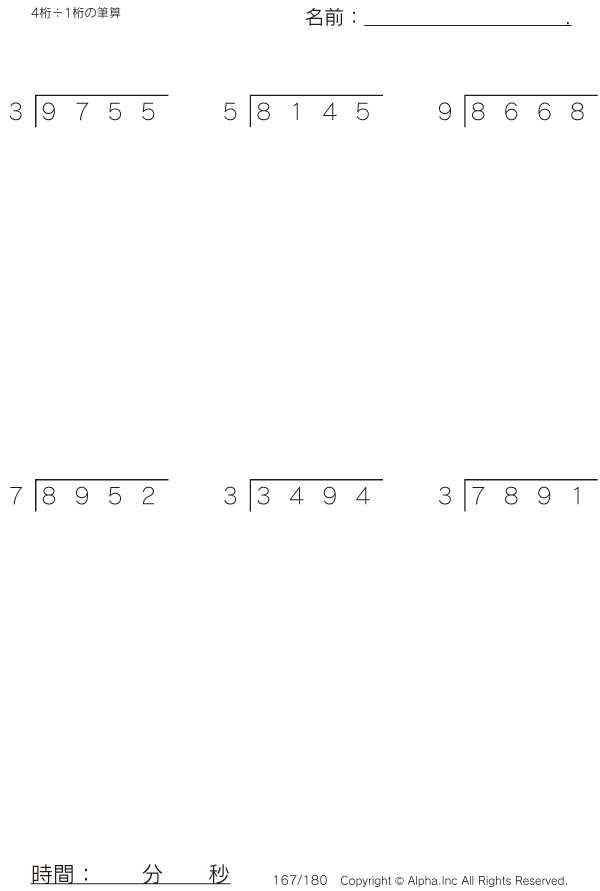 上記のボタンから「4桁÷1桁の筆算」の算数数学ドリル・計算ドリル(PDFプリント)がダウンロードできます。個人利用は無料です(家庭以外での配布は有料です)。