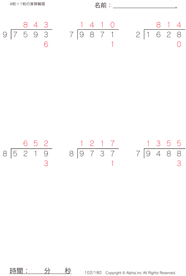 上記のボタンから「4桁÷1桁の筆算」の算数数学ドリル・計算ドリル(PDFプリント)がダウンロードできます。個人利用は無料です(家庭以外での配布は有料です)。