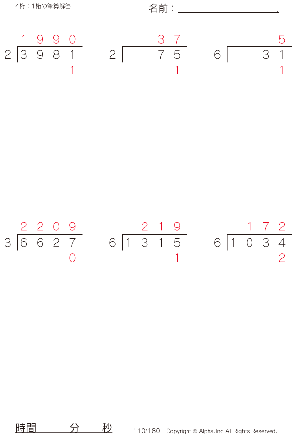 上記のボタンから「4桁÷1桁の筆算」の算数数学ドリル・計算ドリル(PDFプリント)がダウンロードできます。個人利用は無料です(家庭以外での配布は有料です)。