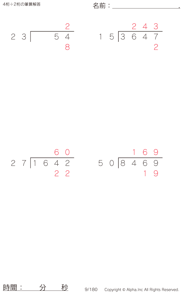上記のボタンから「4桁÷2桁の筆算」の算数数学ドリル・計算ドリル(PDFプリント)がダウンロードできます。個人利用は無料です(家庭以外での配布は有料です)。