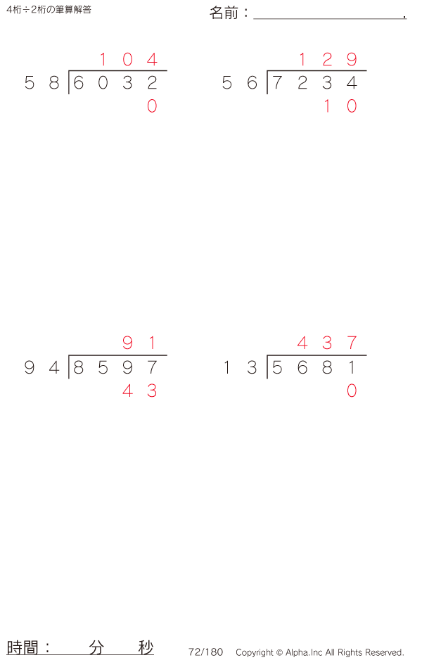 上記のボタンから「4桁÷2桁の筆算」の算数数学ドリル・計算ドリル(PDFプリント)がダウンロードできます。個人利用は無料です(家庭以外での配布は有料です)。