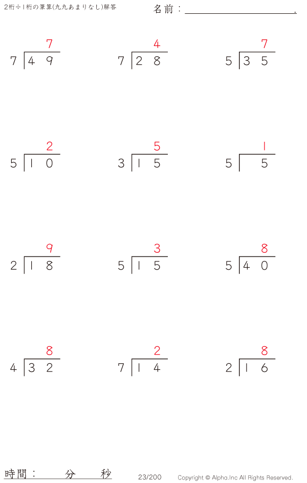 2桁÷1桁の筆算(九九 あまりなし) [解答]023/200