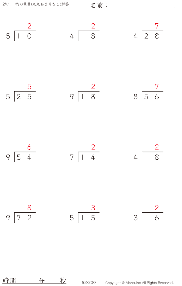 2桁÷1桁の筆算(九九 あまりなし) [解答]058/200