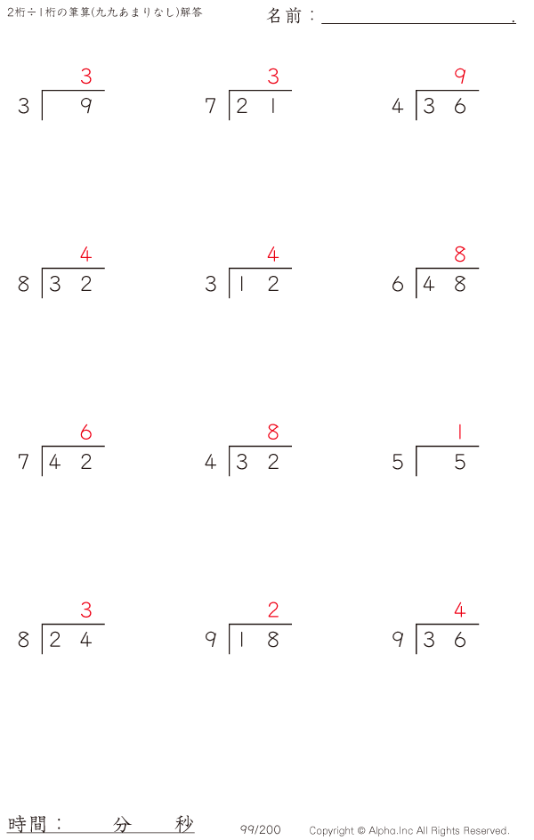 2桁÷1桁の筆算(九九 あまりなし) [解答]099/200