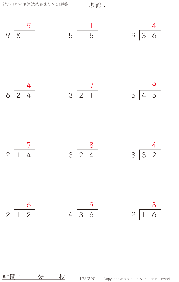 2桁÷1桁の筆算(九九 あまりなし) [解答]172/200