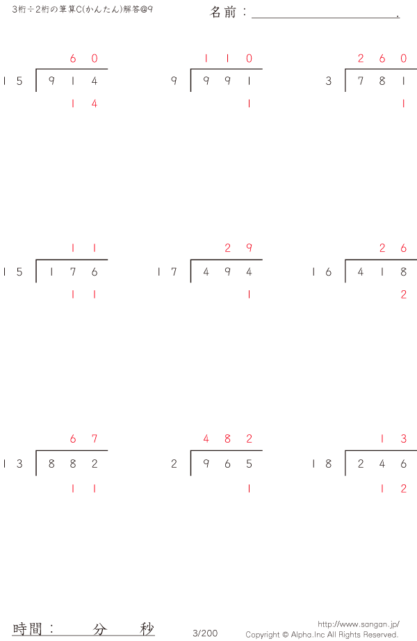 3桁÷2桁の筆算0(20までの数値で割る)@9 [解答]003/200