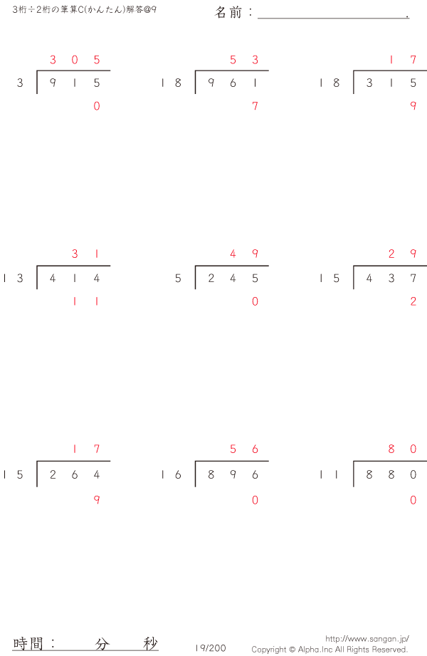 3桁÷2桁の筆算0(20までの数値で割る)@9 [解答]019/200
