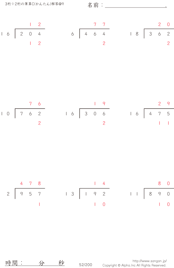 3桁÷2桁の筆算0(20までの数値で割る)@9 [解答]052/200