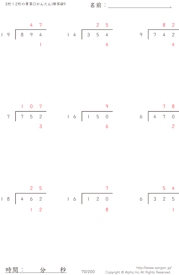 3桁÷2桁の筆算0(20までの数値で割る)@9 [解答]070/200