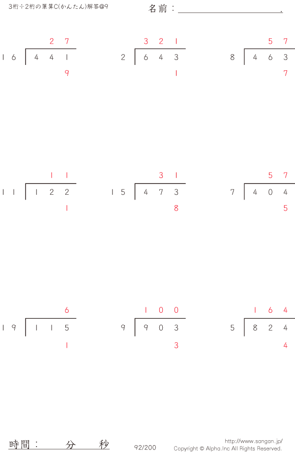 3桁÷2桁の筆算0(20までの数値で割る)@9 [解答]092/200