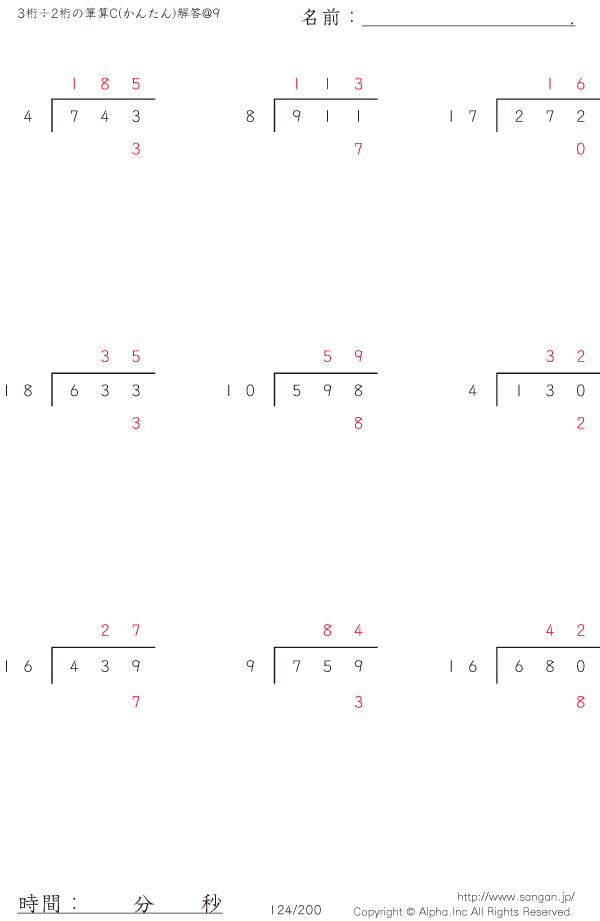 3桁÷2桁の筆算0(20までの数値で割る)@9 [解答]124/200