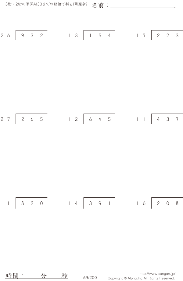 3桁÷2桁の筆算A(30までの数値で割る)@9 [問題]069/200