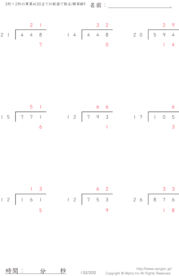 3桁÷2桁の筆算A(30までの数値で割る)@9 [解答]132/200