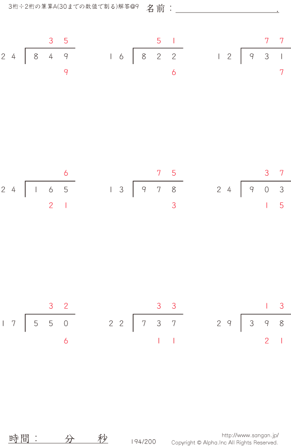 3桁÷2桁の筆算A(30までの数値で割る)@9 [解答]194/200