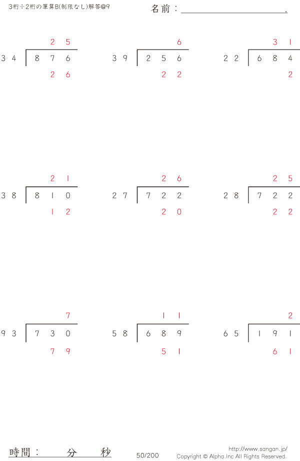 3桁÷2桁の筆算B(制限なし)@9 [解答]050/200