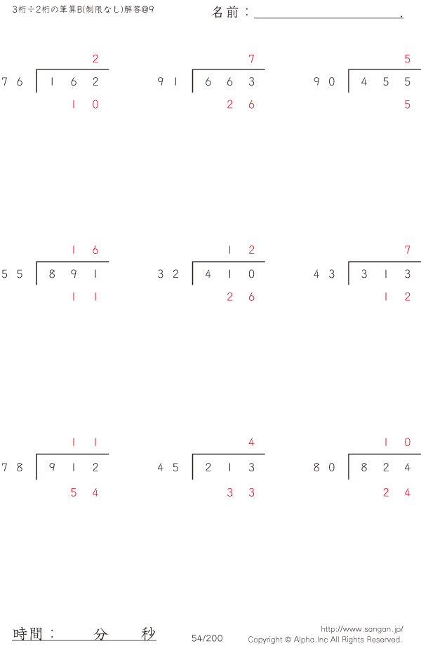 3桁÷2桁の筆算B(制限なし)@9 [解答]054/200
