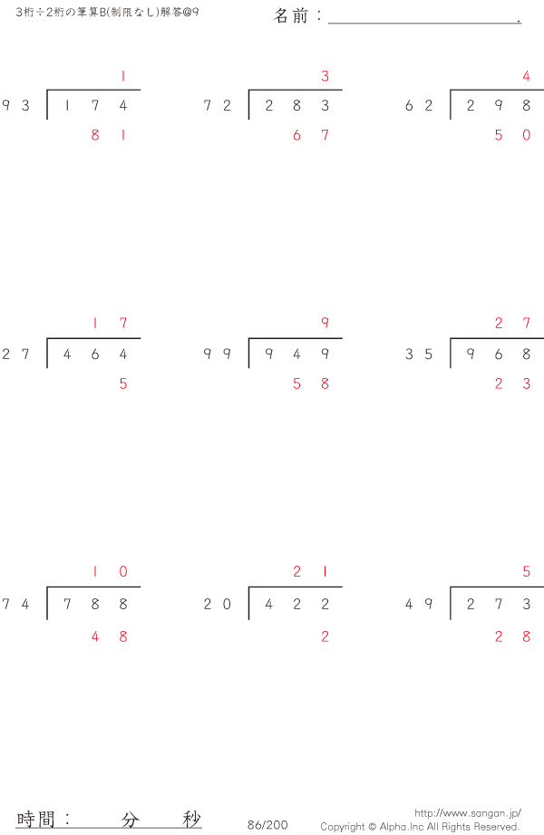 3桁÷2桁の筆算B(制限なし)@9 [解答]086/200