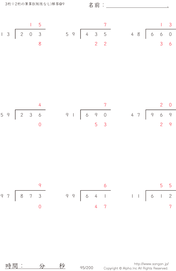 3桁÷2桁の筆算B(制限なし)@9 [解答]095/200