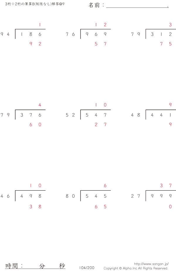 3桁÷2桁の筆算B(制限なし)@9 [解答]104/200