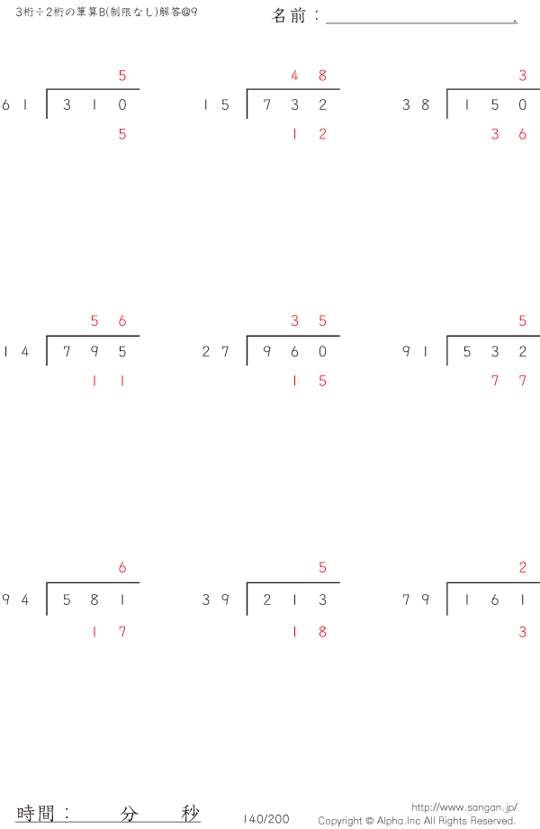 3桁÷2桁の筆算B(制限なし)@9 [解答]140/200