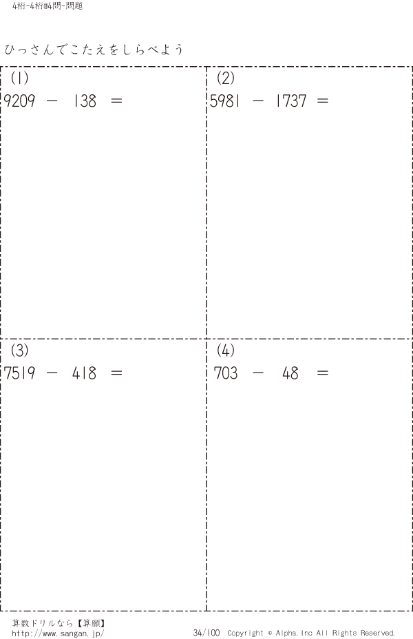 上記のボタンから「自分で4桁-4桁の筆算」の算数数学ドリル・計算ドリル(PDFプリント)がダウンロードできます。個人利用は無料です(家庭以外での配布は有料です)。