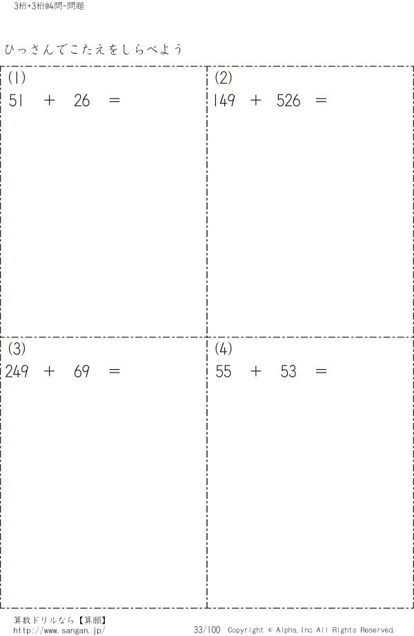 上記のボタンから「自分で3桁+3桁の筆算」の算数数学ドリル・計算ドリル(PDFプリント)がダウンロードできます。個人利用は無料です(家庭以外での配布は有料です)。