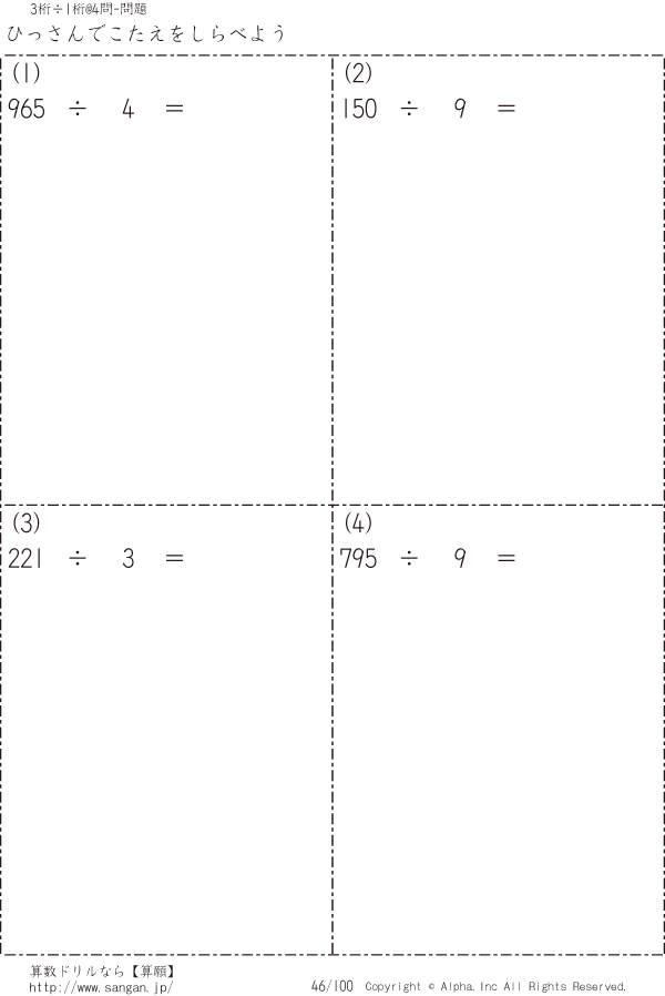 上記のボタンから「自分で3桁÷1桁の筆算」の算数数学ドリル・計算ドリル(PDFプリント)がダウンロードできます。個人利用は無料です(家庭以外での配布は有料です)。