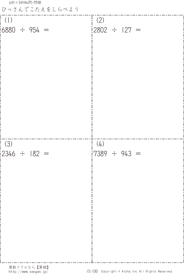 上記のボタンから「自分で4桁÷3桁の筆算」の算数数学ドリル・計算ドリル(PDFプリント)がダウンロードできます。個人利用は無料です(家庭以外での配布は有料です)。