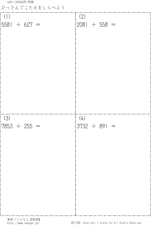 上記のボタンから「自分で4桁÷3桁の筆算」の算数数学ドリル・計算ドリル(PDFプリント)がダウンロードできます。個人利用は無料です(家庭以外での配布は有料です)。