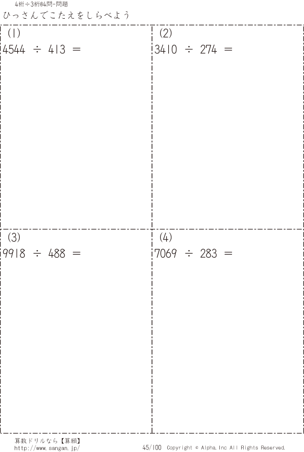 上記のボタンから「自分で4桁÷3桁の筆算」の算数数学ドリル・計算ドリル(PDFプリント)がダウンロードできます。個人利用は無料です(家庭以外での配布は有料です)。