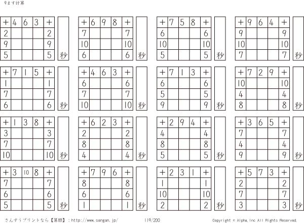 上記のボタンから「9ます足し算(3マス×3マス)」の算数数学ドリル・計算ドリル(PDFプリント)がダウンロードできます。個人利用は無料です(家庭以外での配布は有料です)。