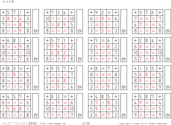 上記のボタンから「9ます足し算(3マス×3マス)」の算数数学ドリル・計算ドリル(PDFプリント)がダウンロードできます。個人利用は無料です(家庭以外での配布は有料です)。