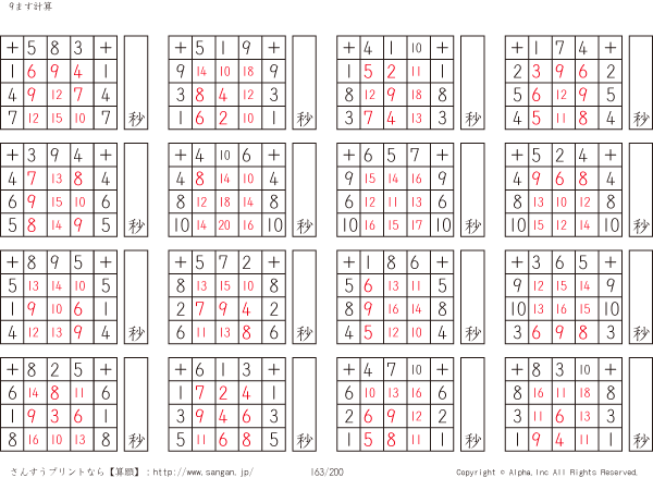 上記のボタンから「9ます足し算(3マス×3マス)」の算数数学ドリル・計算ドリル(PDFプリント)がダウンロードできます。個人利用は無料です(家庭以外での配布は有料です)。