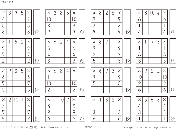 上記のボタンから「9ます掛け算(3マス×3マス)」の算数数学ドリル・計算ドリル(PDFプリント)がダウンロードできます。個人利用は無料です(家庭以外での配布は有料です)。