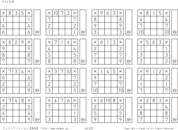 上記のボタンから「9ます掛け算(3マス×3マス)」の算数数学ドリル・計算ドリル(PDFプリント)がダウンロードできます。個人利用は無料です(家庭以外での配布は有料です)。