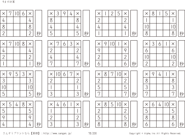 上記のボタンから「9ます掛け算(3マス×3マス)」の算数数学ドリル・計算ドリル(PDFプリント)がダウンロードできます。個人利用は無料です(家庭以外での配布は有料です)。