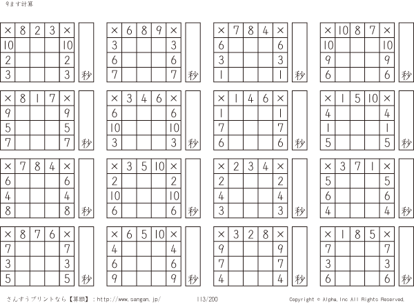 上記のボタンから「9ます掛け算(3マス×3マス)」の算数数学ドリル・計算ドリル(PDFプリント)がダウンロードできます。個人利用は無料です(家庭以外での配布は有料です)。
