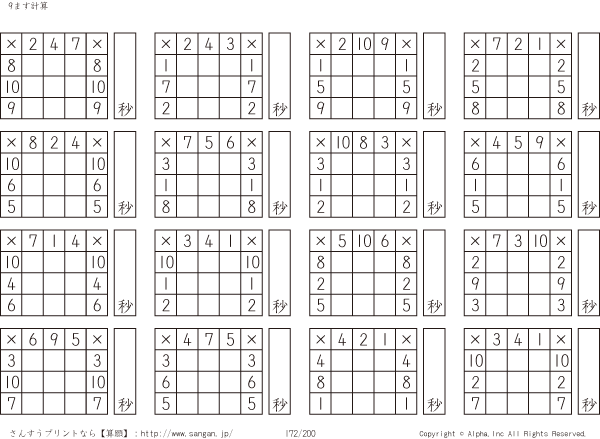上記のボタンから「9ます掛け算(3マス×3マス)」の算数数学ドリル・計算ドリル(PDFプリント)がダウンロードできます。個人利用は無料です(家庭以外での配布は有料です)。