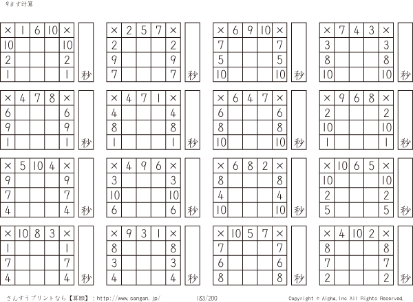 上記のボタンから「9ます掛け算(3マス×3マス)」の算数数学ドリル・計算ドリル(PDFプリント)がダウンロードできます。個人利用は無料です(家庭以外での配布は有料です)。