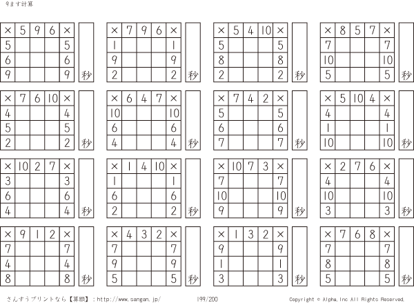 上記のボタンから「9ます掛け算(3マス×3マス)」の算数数学ドリル・計算ドリル(PDFプリント)がダウンロードできます。個人利用は無料です(家庭以外での配布は有料です)。