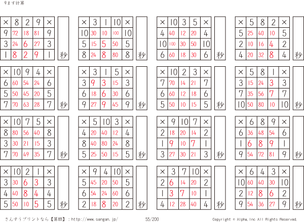 上記のボタンから「9ます掛け算(3マス×3マス)」の算数数学ドリル・計算ドリル(PDFプリント)がダウンロードできます。個人利用は無料です(家庭以外での配布は有料です)。