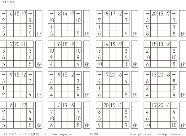 9ます引き算(3マス×3マス) [問題]120/200